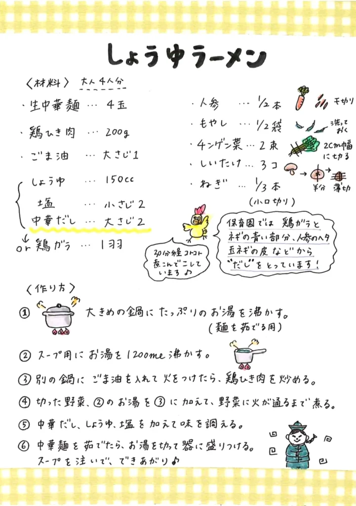 保育園では 鶏ガラと ネギの青い部分、人参のヘタ玉ネギの皮などから「だし」をとっています。